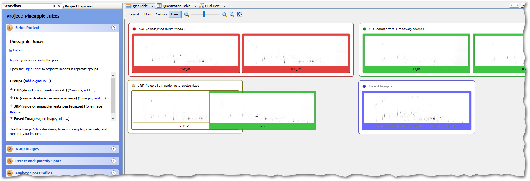 The aim of this step is to creat an optimal input for quantitative analysis - expression profiles that include reliably matched spots but no missing values. This is done by applying a consensus spot pattern - created on a fused image - to all images of the project.